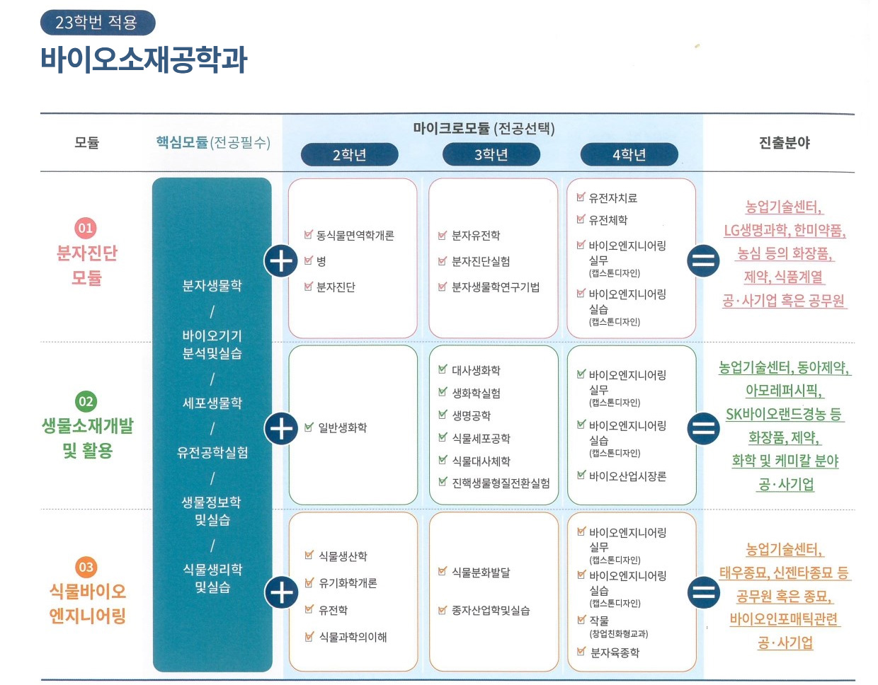 • 학과 마이크로모듈 구성 단편화된 일체형 전공교과목에서 벗어나 학문적/실용적 특성에 맞추어 체계화함으로써 바이오소재공학과에 공부하는 내용을 영역별로 명확하게 함