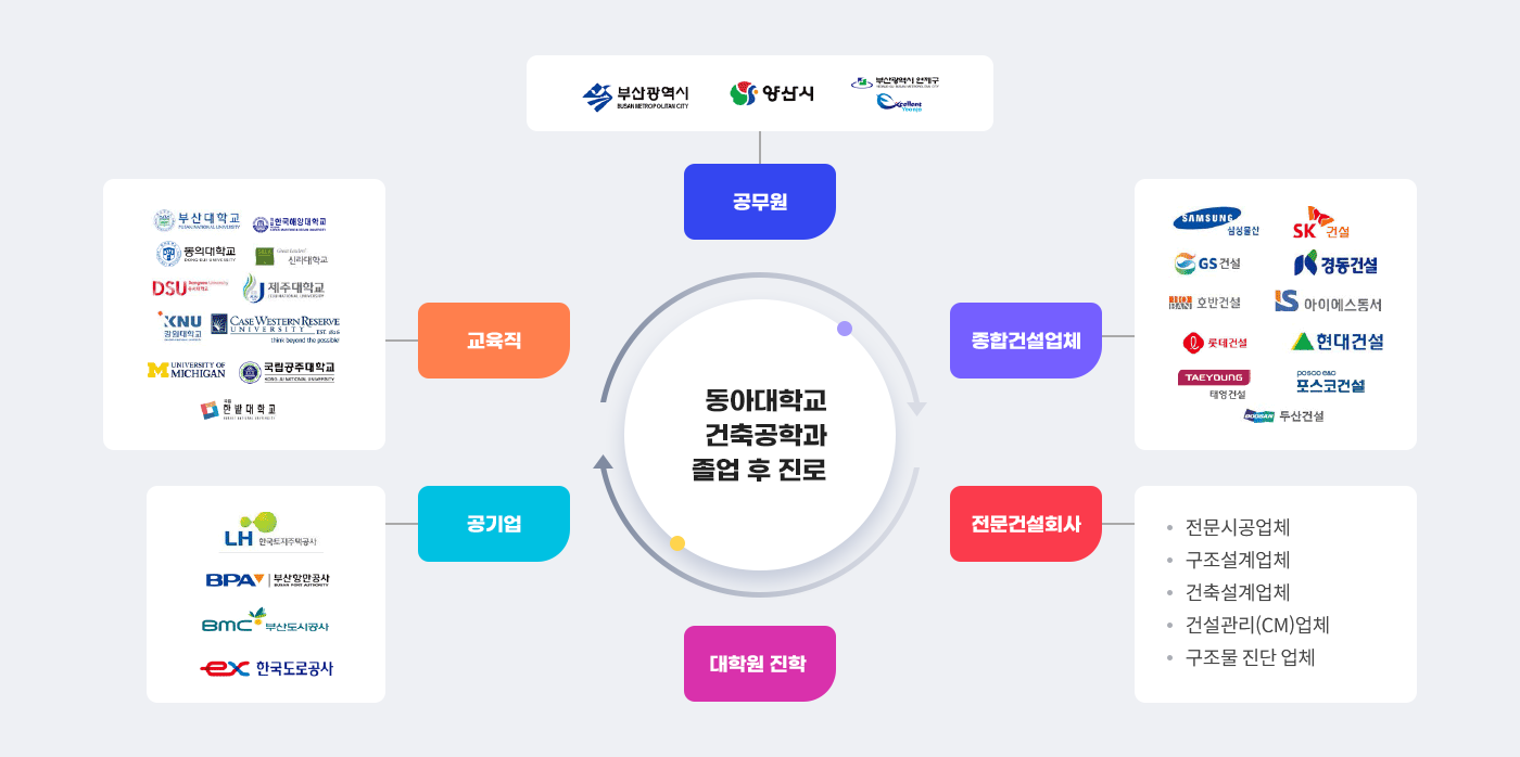 종합건설업체에서, 부산을 대표하는 ㈜경동건설, ㈜반도종합건설 등의 대표이사가 우리 졸업생이며, 현대건설㈜, 삼성물산㈜, 두산건설㈜, 포스코건설㈜, SK건설㈜, ㈜태영건설 등 국내 대표적 건설사에서 임원으로 활약하고 있습니다.