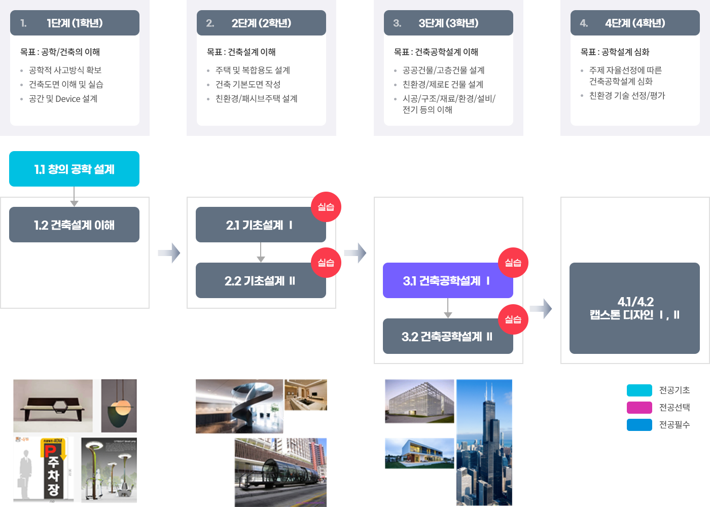 - 3단계(3학년)에는 RC구조, 철골구조 I, II 수강하여 건물의 각부재를 설계하는 능력을 배양
