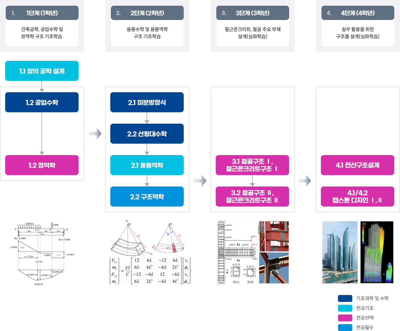 - 4단계(4학년)에는 전산구조I, II, 공학프로젝트I, II를 수강하여 건축구조 실무능력을 배양