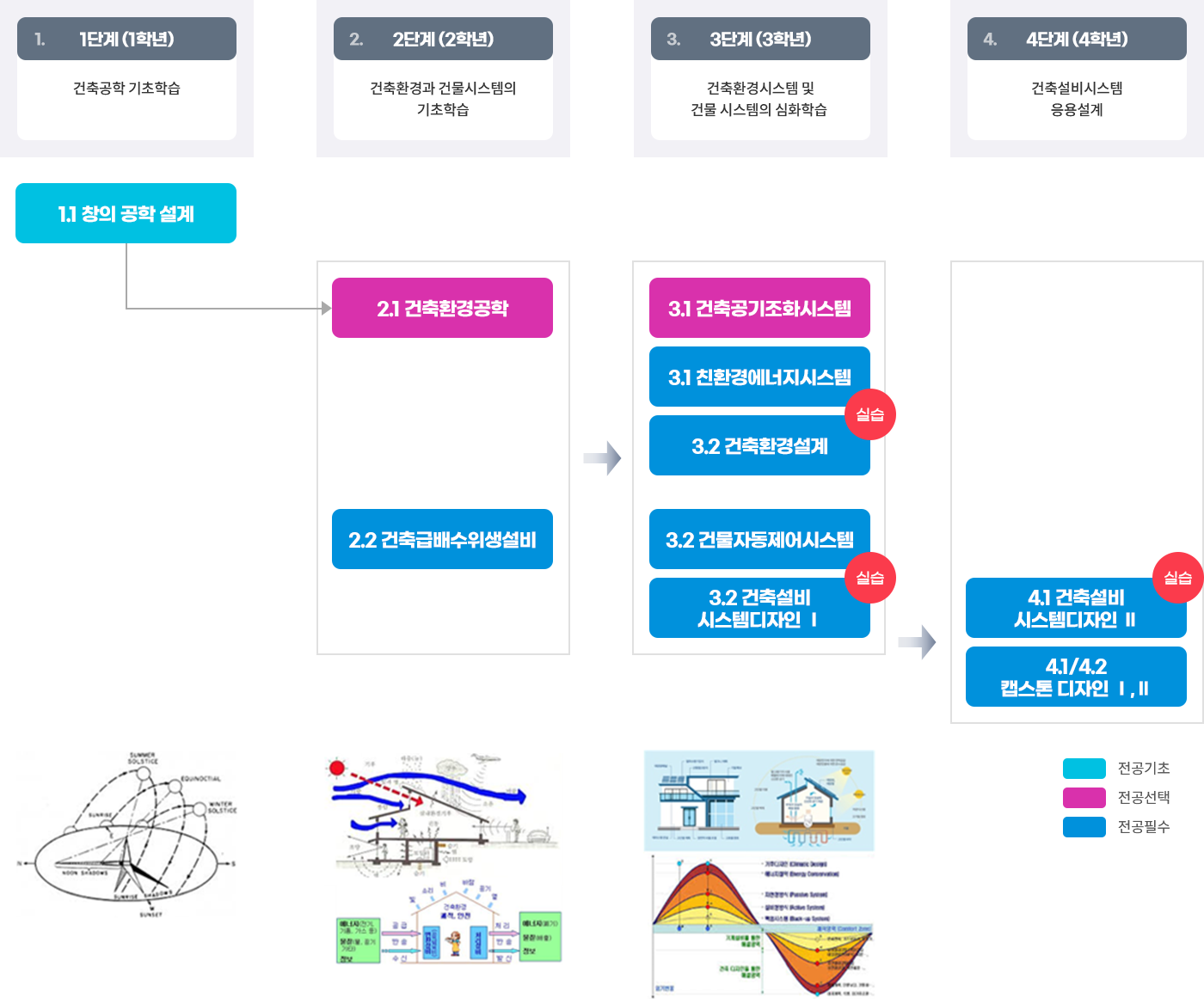 - 3단계(3학년)에는 건축공기조화시스템, 친환경에너지시스템, 건축환경설계, 건물자동제어시스템, 건축설비시스템디자인(I)을 수강하여 건물시스템의 심화학습 및 설계능력을 배양함